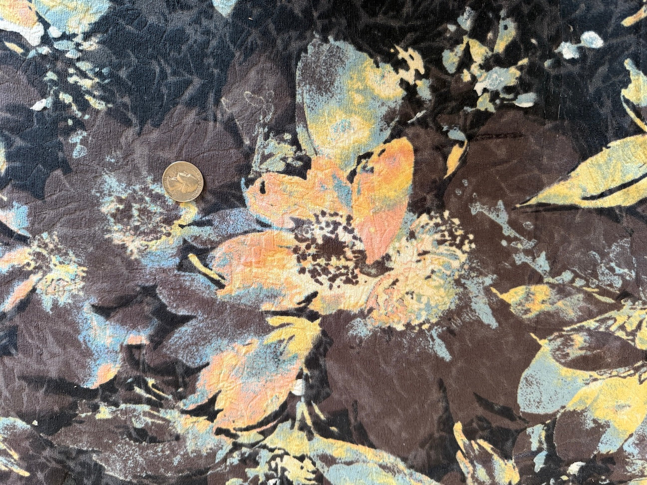 Rich, deep pile like velvet, but in a stretch knit. Mostly cotton, with a teensy bit something else - it's a mystery. It has lovely yellow, peach, and ice blue flowers on a background of grays and blacks. It's very Impressionistic! There is a small "burnout" design mixed in there, but it's not sheer at all.